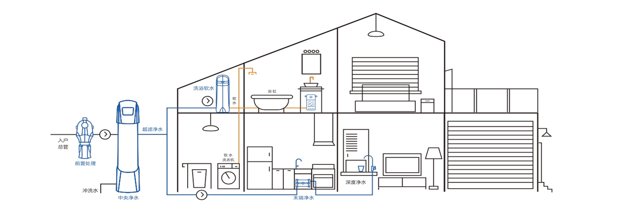 全屋凈水系統是從水源入戶開始,根據家庭不同用水點需求,通過不同凈水產品科學合理搭配,將家庭飲水、廚房用水、洗漱、沐浴及洗衣等生活飲用水進行全方位深度凈化,以全面深度保護家人身體健康及熱水器、洗衣機、浴缸、淋浴器、智能馬桶等家用涉水設備。全屋凈水系統一般由前置處理產品、中央凈水產品、軟水產品、末端凈水產品組成。